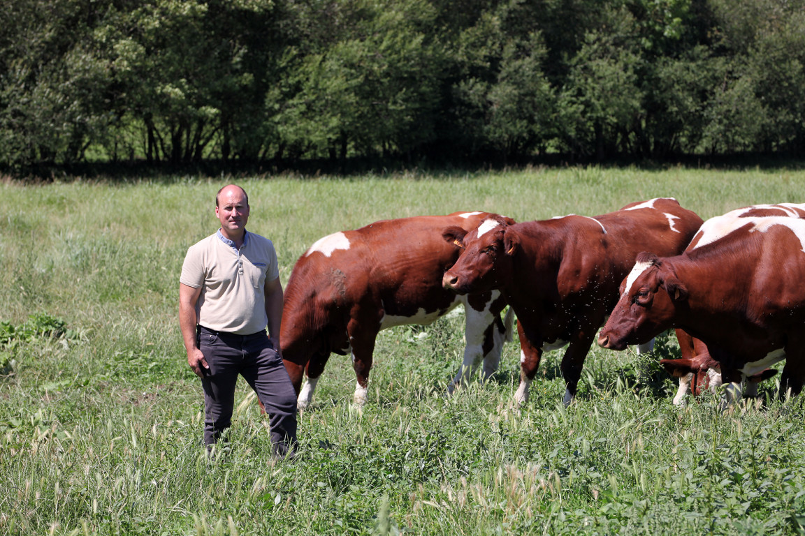 Comme toute sa famille, éleveurs et marchands de vaches, l’exploitant s’est installé en 2010 et ses parents se sont retirés en 2014, après environ 40 ans de bons et loyaux services. Le cheptel est constitué de 75 vaches sur 140 hectares dont 20 destinés à la nourriture et 100 de prés pâtures. Sur la ferme est donné toute l’année un complément à bas de maïs, lin extrudé ou soufflé (apport de protéines et calories), féverole (légumineuse ou petite fève fourragère, riche en protéines végétales). Principalement à cause des OGM, il a arrêté le soja. Les dernières semaines, les animaux mangent aussi du blé aplati, de la pulpe de betterave, de l’enrubannage de pré c’est à dire de l’herbe d’avril un peu séchée, de la luzerne, du trèfle violet, et de l’avoine.
